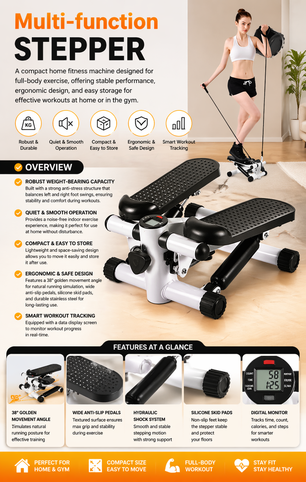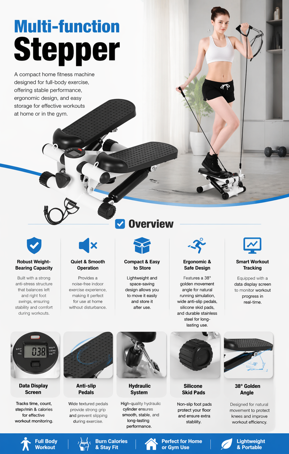 Multi-function Stepper – A compact home fitness machine designed for full-body exercise, offering stable performance, ergonomic design, and easy storage for effective workouts at home or in the gym.